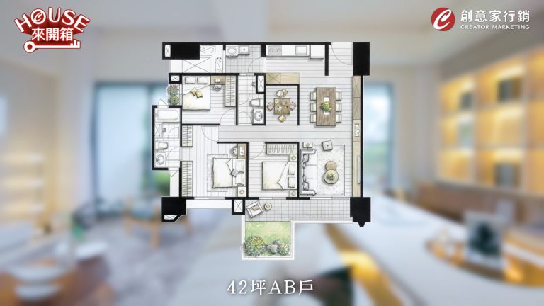 接著為您展示的是42坪AB戶,邊間雙面大陽台,全室開窗通透,讓生活從早到晚都沐浴在自然光中,雙廳連動設計,客餐廳與陽台連成一氣,延伸公區大尺度。主臥尊榮套房,寬敞舒適兼顧隱私與機能動線,雙衛浴皆開窗,乾濕分離,主臥更採四件式衛浴,日常使用清爽舒適,L型廚房配置動線清晰,收納完整,料理也能大器從容。