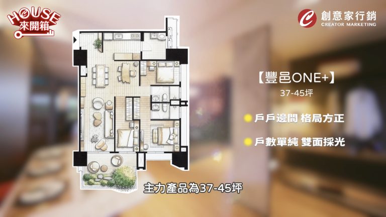 豐邑ONE+規劃一層四戶, 戶戶邊間,戶數單純,主力產品為37-45坪,正三房和三加一房,45坪雙面採光,格局方正,樑柱外推,極大化使用坪效,10米5氣派橫廳尺度,迎向大陽台日光綠意,美式餐廚空間開放式設計,延伸生活風景。